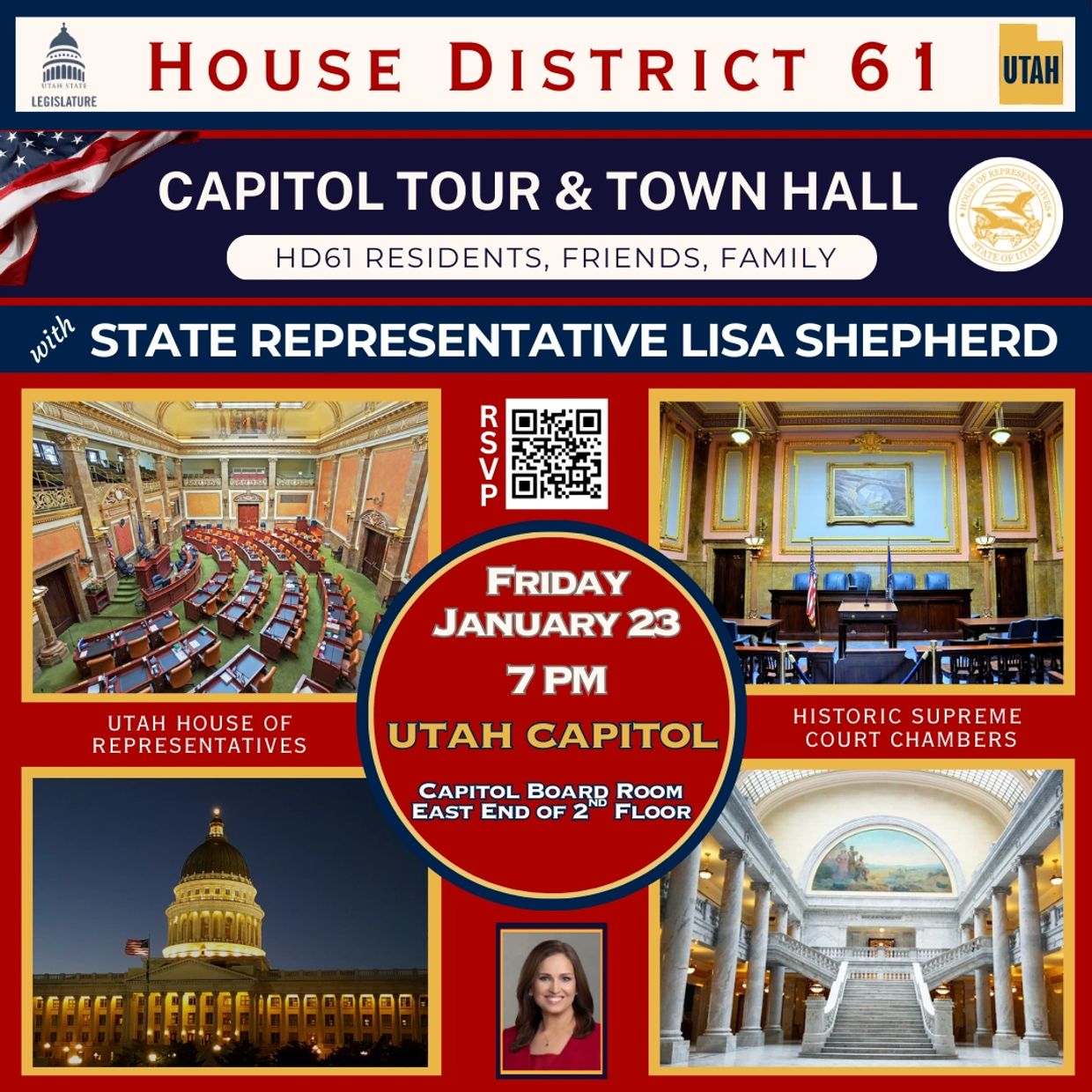 Join Representative Lisa Shepherd on the first Friday evening of the 2026 Legislative Session, January 23, 7:00 p.m. for a town hall and personal tour of Capitol Hill.